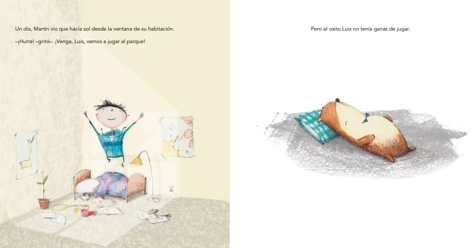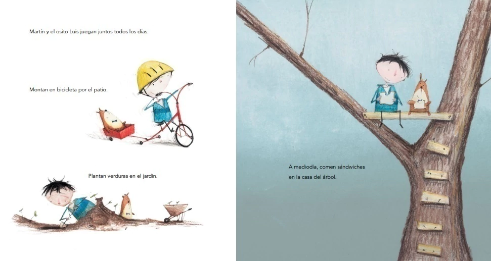 Martín es un niño que juega siempre con su osito Luis. Montan en bicicleta, plantan verduras en el jardín, al mediodía comen en el columpio del árbol y por las tardes, si llueve, meriendan dentro de la casa. Una mañana soleada Martín se levantó muy contento deseando salir a jugar al parque, pero Luis seguía acostado, estaba triste y sin ganas de nada. En el columpio, Luis seguía callado y desánimado. Martín le dijo que le contara lo que le pasaba, que fuera lo que fuera él siempre sería su amigo. Osito Luis le confesó que necesitaba ser él mismo, que siempre había sabido que en realidad era una osita y no un osito y que le gustaría llamarse Luisa en lugar de Luis. A Martín lo único que le importaba era tener siempre su amistad. Luisa se cambió la pajarita que llevaba en el cuello y se la puso, como un bonito lazo, en el pelo. Se sentía muy feliz y contenta compartiendo los juegos con su inseparable amigo Martín. Un precioso álbum de EDITORIAL ALGAR con simpáticas ilustraciones a color en simbiosis con la conmovedora y tierna historia sobre la amistad, la transexualidad. el respeto a la identidad sexual, la aceptación y la felicidad. Una entrañable historia, una atractiva propuesta que rompe de manera natural con los estereotipos de género e invita a niños y niñas a ser ellos mismos o ellas mismas y a respetar las diferencias.