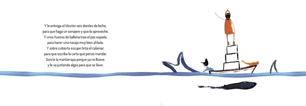 Un cuento en verso alejandrino, de mucho humor. Ilustrado con trazos simples y muy expresivos. Editado por PIPALA, el sello de libros ilustrados de Adriana Hidalgo Editora Un marinero sale en su embarcación a pescar, tiene hambre. Pero en lugar de un pez, saca del mar una caja de hierro, con un perro adentro. Y luego una extraña caja, con un gato. El perro persigue al gato. Y una nueva caja, con un pollo. Y el marinero terminará con algas y pensará en una tortilla para convidar al perro, al pollo y al gato.