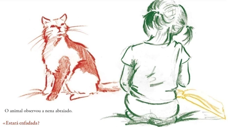 "Nina y Antón" plasma un momento cotidiano entre una niña y su gato, que mantienen un tierno diálogo: las palabras de ella se entretejen con los pensamientos de él, hasta el punto de que parecen entenderse. La convergencia entre el relato sencillo y descriptivo de Antonio Ventura y las ilustraciones minimalistas de Alejandra Estrada alcanza su plenitud con la identificación cromática entre la voz y la figura de cada protagonista. Un tercer personaje es el libro que Nina le lee a Antón; se trata del clásico "Ernesto y Celestina" de Gabrielle Vincent, a quien está dedicada esta obra. Su influencia no solo es literaria, sino que también inspira el estilo clásico y expresionista de las imágenes, esbozadas con trazos ágiles y dinámicos, marcando la gestualidad y la expresividad corporal de ambos. La constante interpelación de Nina al felino, la condescendencia de Antón hacia la niña y un sutil sentido del humor están presentes en esta historia; también la frontera difusa entre la realidad y la fantasía, con el libro como mágico pasadizo entre los dos mundos. Editado por KALANDRAKA.