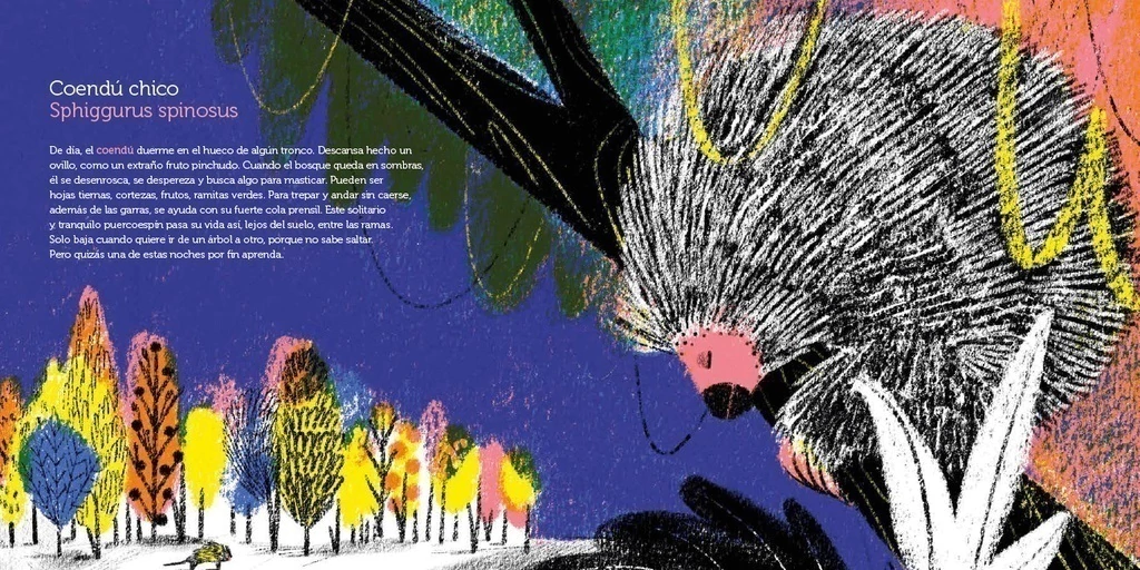 ¿Qué sucede en las selvas y los bosques cuando el sol se oculta? Algunos animales descansan y otros recién se despiertan. Este libro propone indagar en las costumbres de los habitantes de la noche a través de microrrelatos e ilustraciones de Cyntia Alonso. Una excursión nocturna a las curiosidades del monito mirikiná, del murciélago pescador, la paca, las luciérnagas, la lechuza, la serpiente en la que los misterios de la oscuridad empiezan a develarse. Esta colección de Editorial OJOREJA nos sumerge en la naturaleza y nos invita a explorar a las especies que habitaron y habitan nuestra región, con una apuesta visual artística.